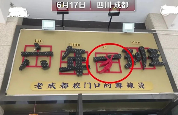 6月17日,某视频拍客在成都发现,遍布成都的串串餐馆“六年一班”和“六年二班”,大量使用红领巾标识作为店铺LOGO。